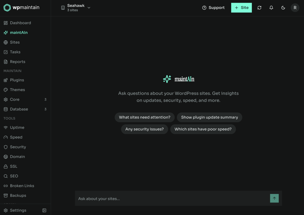 mAIntain Chat is an intelligent WordPress support co-pilot built into WP Maintain. It connects your choice of AI model — Claude, OpenAI, or Gemini — directly to your WP Maintain data, giving hosting teams and their customers instant, site-specific insight. With site-level data at their fingertips, support staff can diagnose issues faster, reduce escalations, and prevent problems before they become tickets.