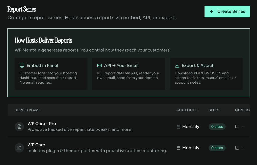 WP Maintain was developed by Seahawk, a WordPress services company specializing in white-label WP Care and tech support for web hosts. Leveraging this experience, the platform was built specifically for web hosts.